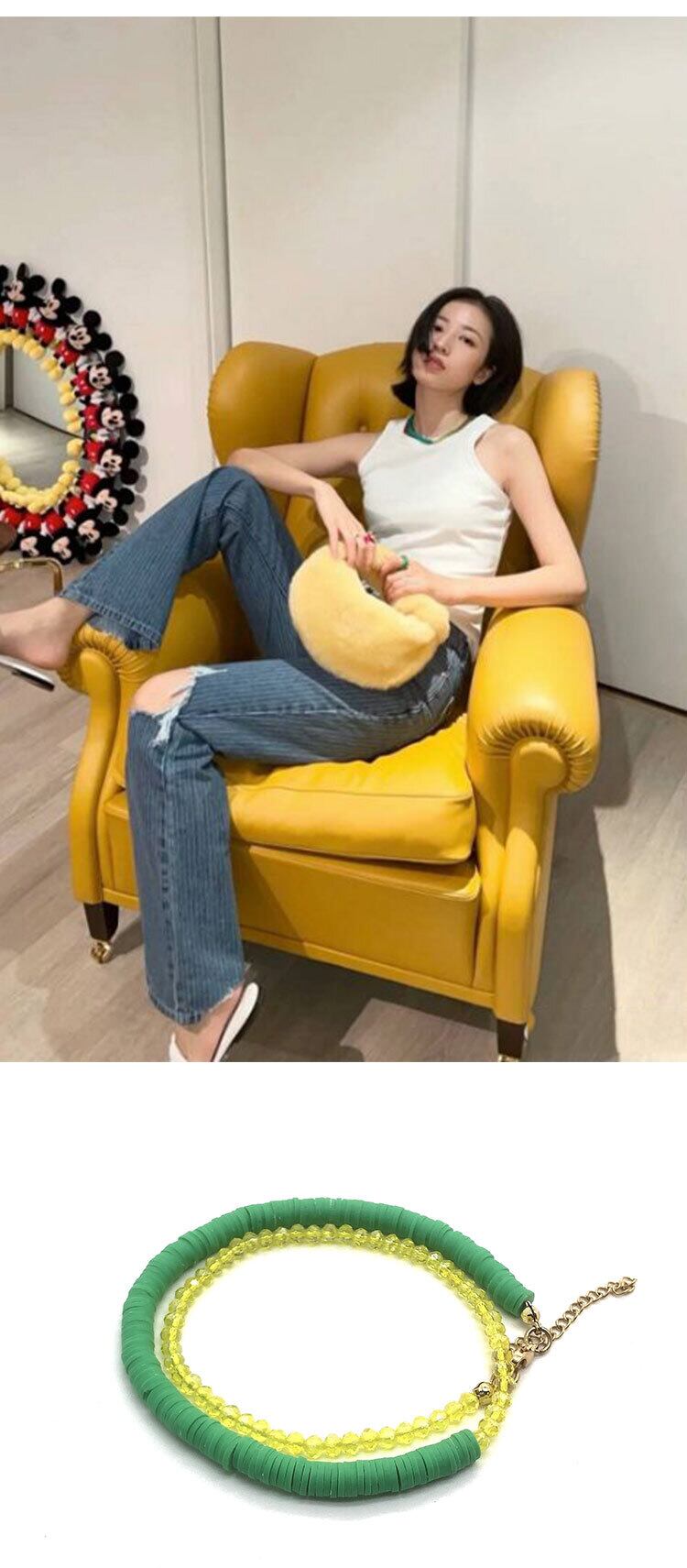 色:ZhouYutong1グリーンとイエローのステッチネックレス